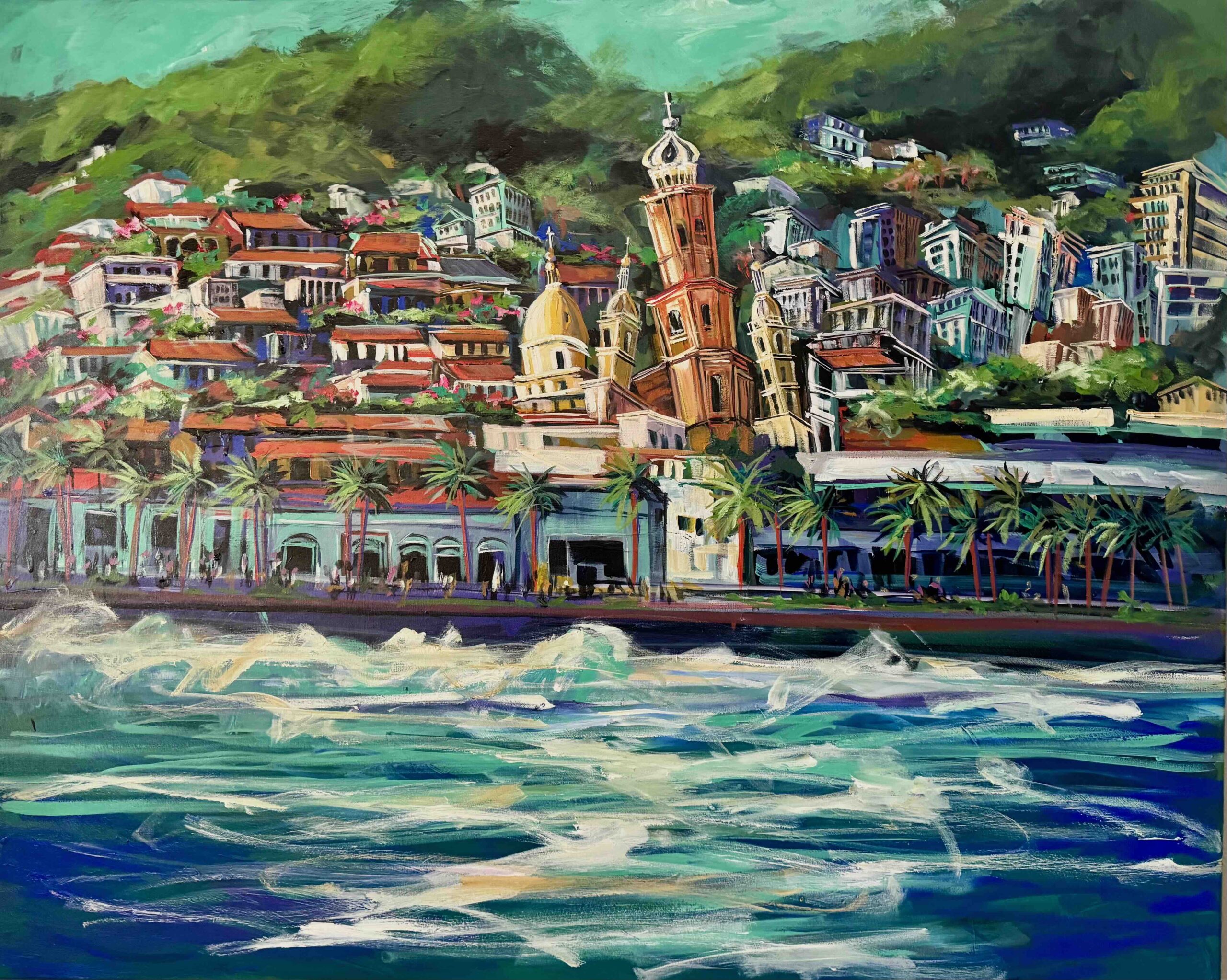 Painted from the perspective of the sea, Rockin’ Rhythm PV invites the viewer to experience Puerto Vallarta as if sailing gently through the Bay of Banderas—where the ocean’s movement mirrors the city’s heartbeat. The view unfolds across the historic Centro, revealing the iconic church towers, colorful hillside homes, and the lively Malecón stretching along the shoreline.
